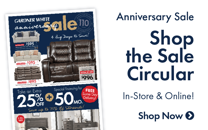 Promotions | Gardner-White Furniture & Mattress On furniture purchases of $699 or more and mattresses purchases of $1499 or more with the Gardner White credit card. 10% down payment required on furniture purchases. Details here. Anniversary Sale. Save up to $1000 on premium mattresses. ... Cannot be combined with other coupons.